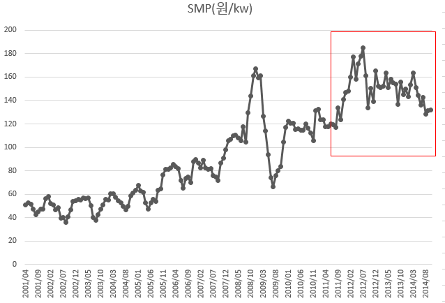 위 SMP추이 그래프는 SMP가격의 변화를 보여주고 있다. 2001년에는 SMP가 50원/kw 수준이었으나, 꾸준히 상승하여 2011년 하반기 이후에는 120원/kw 이상을 유지하고 있다. 이는 2014년 발전원가를 볼 때 LNG발전원가에 근접한 SMP는 SMP결정비율과도 유사한 결과를 보이고 있다.